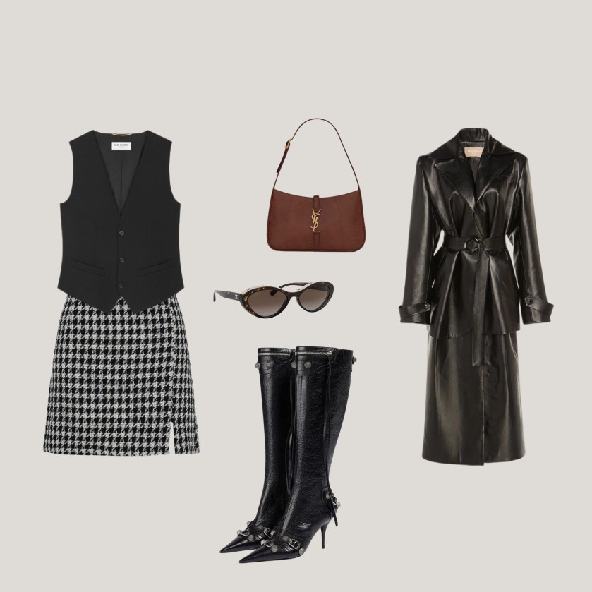 La combinación del cuero con la falda de ‘tweed’ te dará un toque romántico sin dejar a un lado los elementos clásicos. Las botas hasta la rodilla en punta te estilizaran las piernas y el bolso estilo ‘baguette’ te dará un aire moderno.