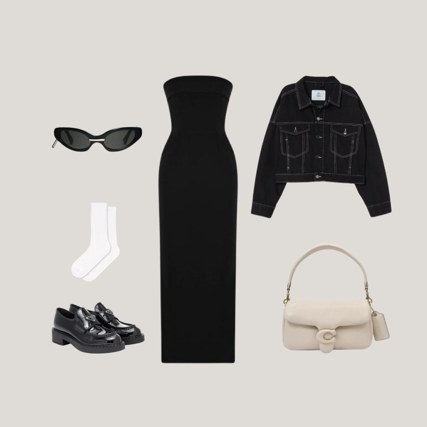 Un vestido básico puede volverse moderno con elementos más en tendencia. En este caso se puede combinar con una chaqueta corta de jean en colores oscuros, unos mocasines con medias abajo de la pantorrilla y accesorios modernos pero estilizados como unas gafas negras alargadas y un bolso nude.