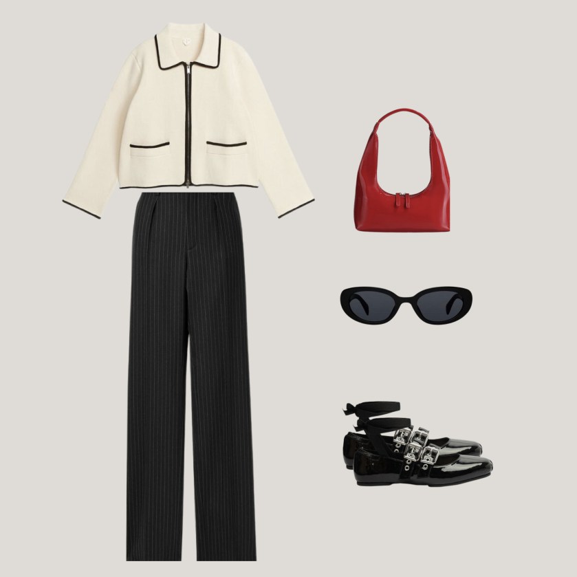Para los que les gusta un estilo un poco más preppy (moda clásica – lujo silencioso), este outfit combina este estilo de manera estilizada y moderna. El suéter con lineas en contorno negras le da un aire al look en combinación de unos pantalones clásicos de líneas. Las baletas/flats le agregan feminidad, tendencia y estilo sin quitar el elemento clásico. Finalmente los accesorios en color rojos, negros o azules serán perfectos para terminar el look.