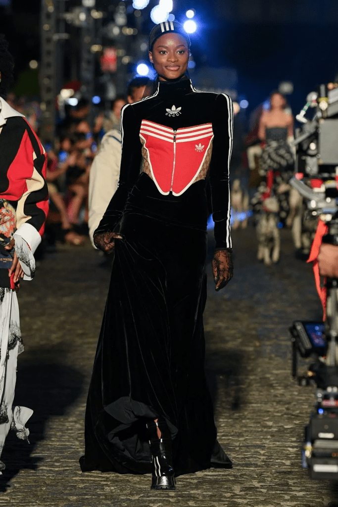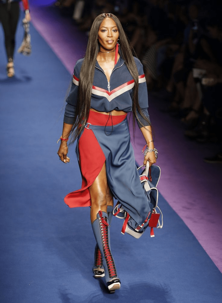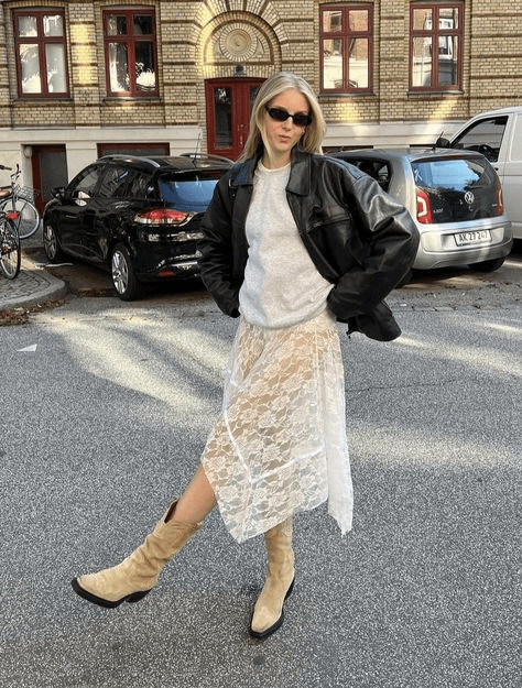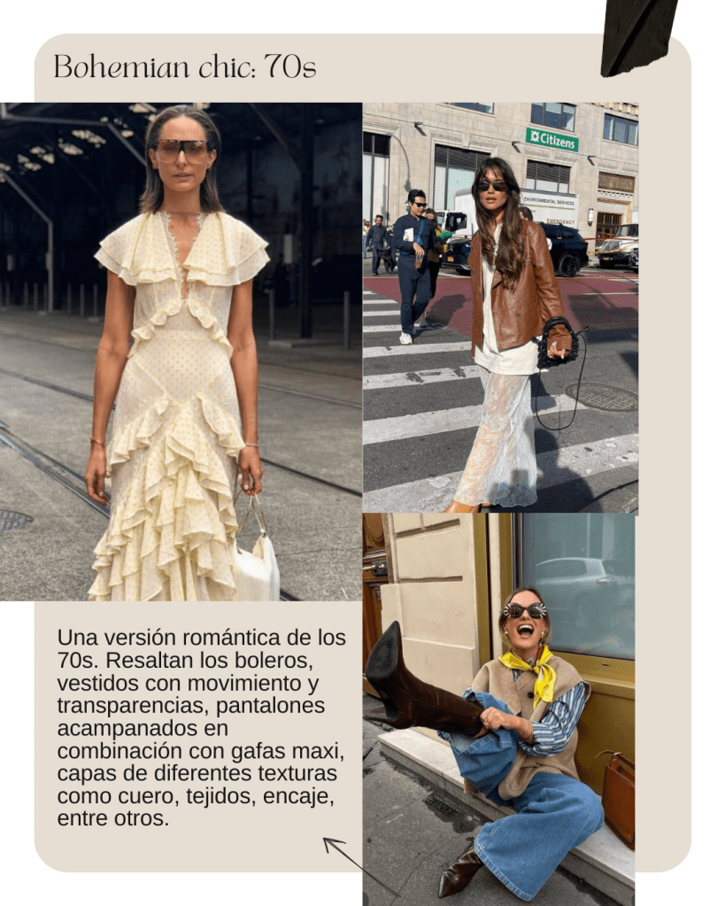 En 2024, este estilo se refleja en mini vestidos con correas maxi, pantalones slouchy con cinturones de tachuelas, animal print, transparencias, y faldas maxi combinadas con botas y cinturones llamativos, contrastando con tops básicos en tonos neutros.