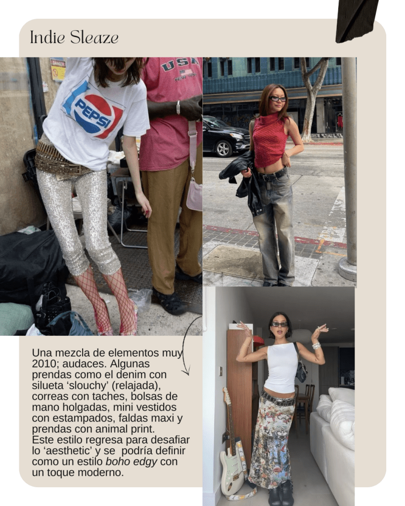 El indie Sleaze es una tendencia que refleja una actitud rebelde en el vestir. En términos de estilo, combina elementos que, a simple vista, no tienen coherencia estética. Esta corriente resurge del estilo predominante en el año 2010 y mezcla influencias del grunge con prendas holgadas o ‘slouchy’ y accesorios llamativos como tachuelas y correas. Va en contra de lo considerado estéticamente atractivo y podría describirse como una forma contemporánea de desafiar lo ‘aesthetic’. Incluso, se le podría definir como un boho edgy con un toque moderno.
